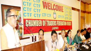 DyCM Dr Nirmal Singh addressing traders during a function in Jammu on Saturday.