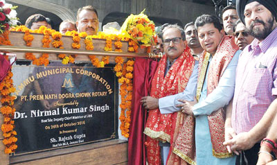 JAMMU, Oct 26: Deputy Chief Minister, Dr Nirmal Singh inaugurated the Pandit Prem Nath Dogra Chowk Rotary here today.