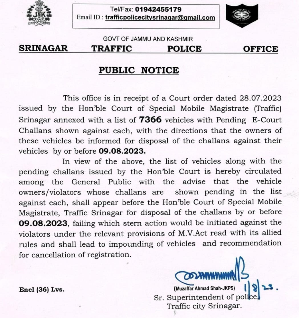 SSP traffic Srinagar, Muzaffar Ahmad Shah issued a public notice quoting a court order. “This office is in receipt of a court order dated 28.07.2023 issued by the Court of Special Mobile Magistrate (Traffic) Srinagar annexed with a list of 7366 vehicles with Pending E-Court Challans shown against each, with the directions that the owners of these vehicles be informed for disposal of the challans against their vehicles by or before 09.08.2023,” the notice said.