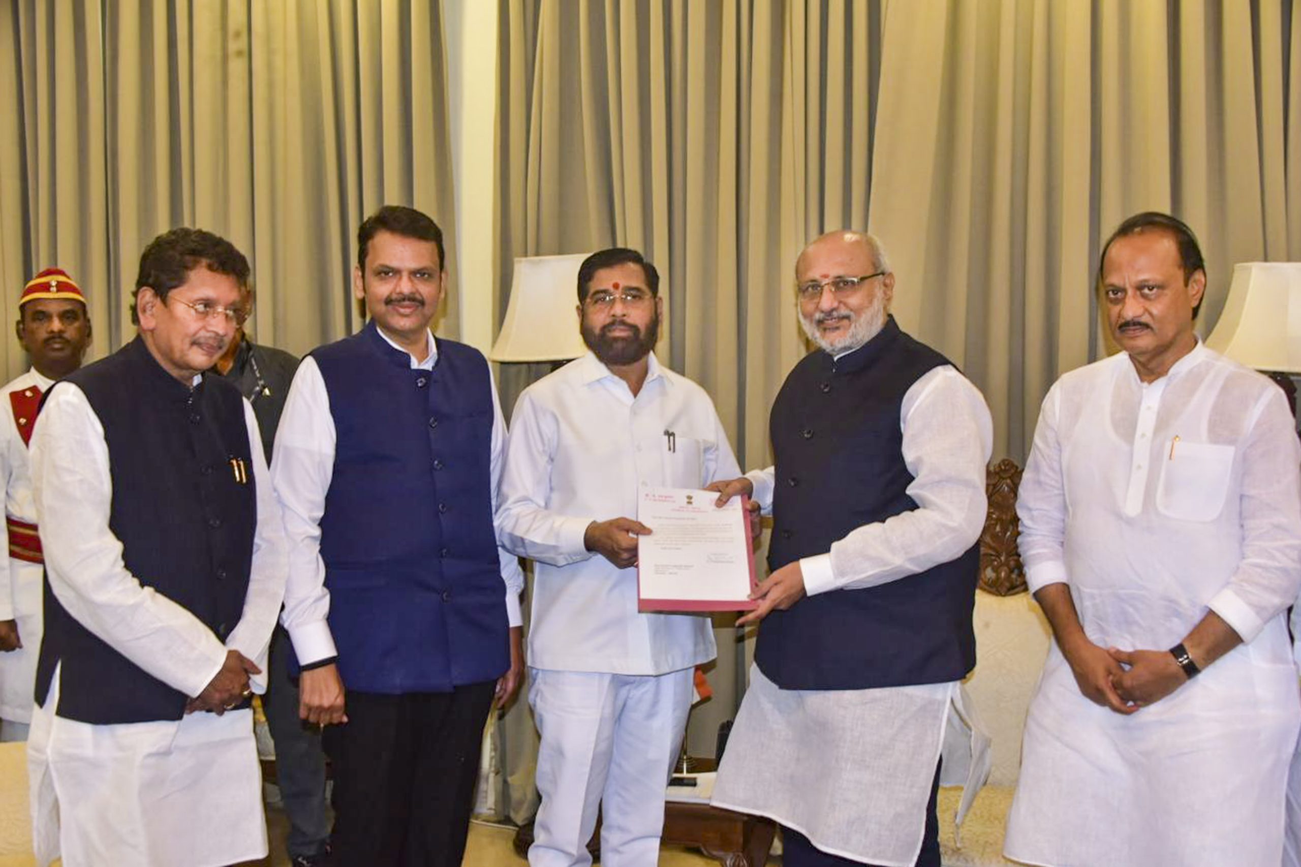 Shinde was accompanied by deputy Chief Ministers Devendra Fadnavis and Ajit Pawar as he visited the Raj Bhavan.