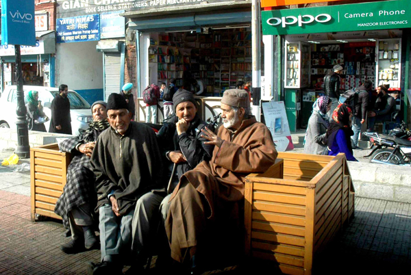 Elders day out in historic Lal Chowk sitting on a bench basking in the Sun as the weather turned pleasant in Srinagar on Sunday. (UNI)