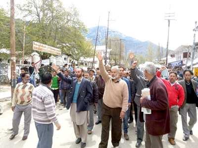 KISHTWAR, Apr 21: The employees today held a massive protest in the town here against the failure of the administration in airlifting the stranded employees who were deputed on election duty in Madwa -Dachan and Wadwan during April 17 polling.