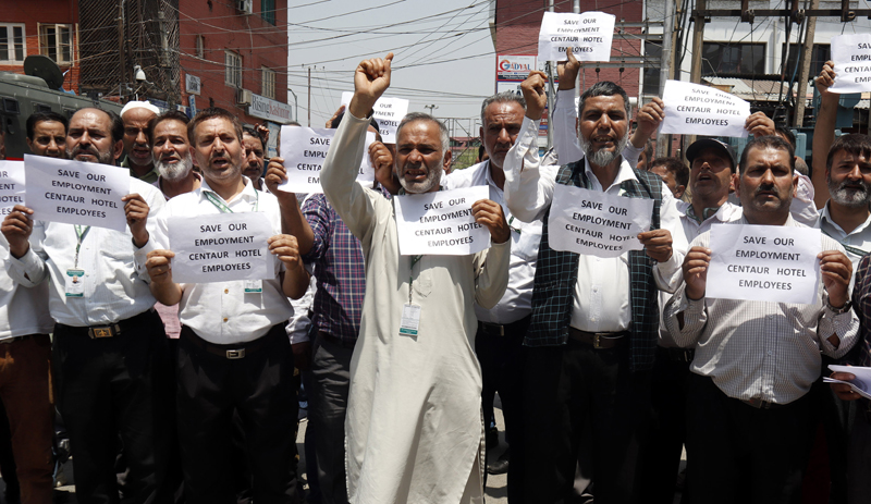 SRINAGAR, June 7: The employees of Centaur Hotel today staged a protest alleging that the hotel was being illegally acquired by some blue-eyed persons.