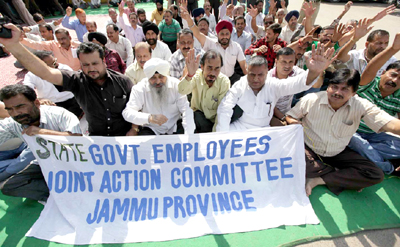 JAMMU/ SRINAGAR, Oct 13: While at least two dozen Government employees were arrested after they took out protest march in Srinagar city, the employees under the banner of a faction of Employees Joint Action Committee (EJAC) staged protest demonstration in support of their demands near Press Club in Jammu today.