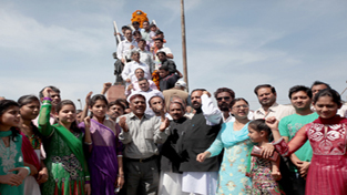 Enthusiastic people raising slogans in praise of Dr B R Ambedkar after garlanding his statue at Jammu on Monday. —Excelsior/Rakesh