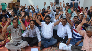 Large number of employees under the banner of All J&K Estate Employees Association Jammu Province assembled in the premises of office of Deputy Director Estate Department Gandhi Nagar here and raised slogans in favour of their demands. The protest was led by President of the Association Prem Singh Bawa.