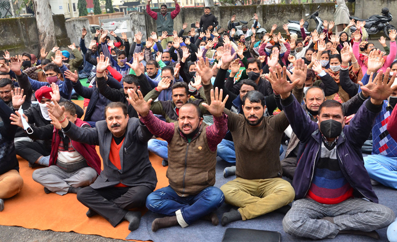 Majority of the employees including daily rated, casual and consolidated workers suspended work on Tuesday and sat on protest dharna in the Divisional Office, near Shakuntla Chowk in Jammu and launched protest demonstration under the banner of J&K Coordination Committee of Estates Employees, Jammu, led by Yash Pal Sharma, chief coordinator.