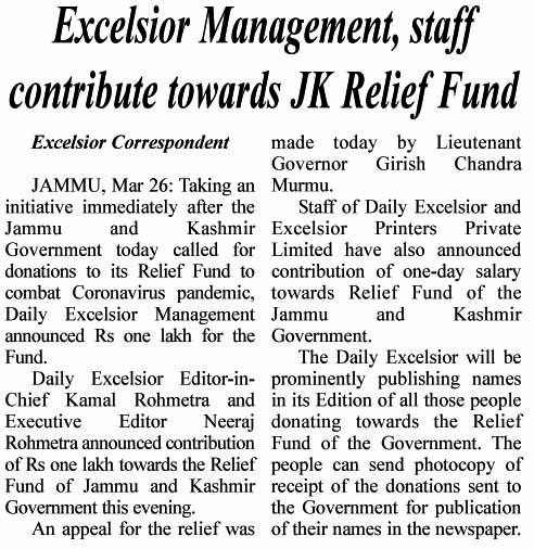 JAMMU, Mar 26: Taking an initiative immediately after the Jammu and Kashmir Government today called for donations to its Relief Fund to combat Coronavirus pandemic, Daily Excelsior Management announced Rs one lakh for the Fund.