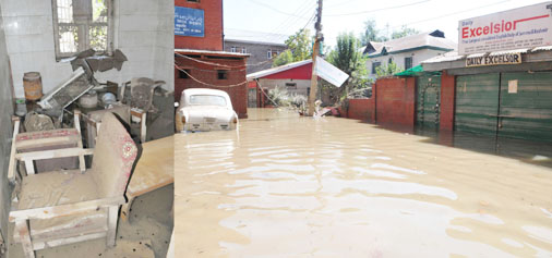 Excelsior office still submerged in water at Partap Park, Srinagar on Tuesday and furniture damaged inside the office. -Excelsior/ Amin War