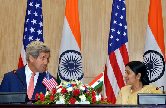 External Affairs Minister Sushma Swaraj and US Secretary of State John Kerry during a joint press conference in New Delhi on Thursday. (UNI)