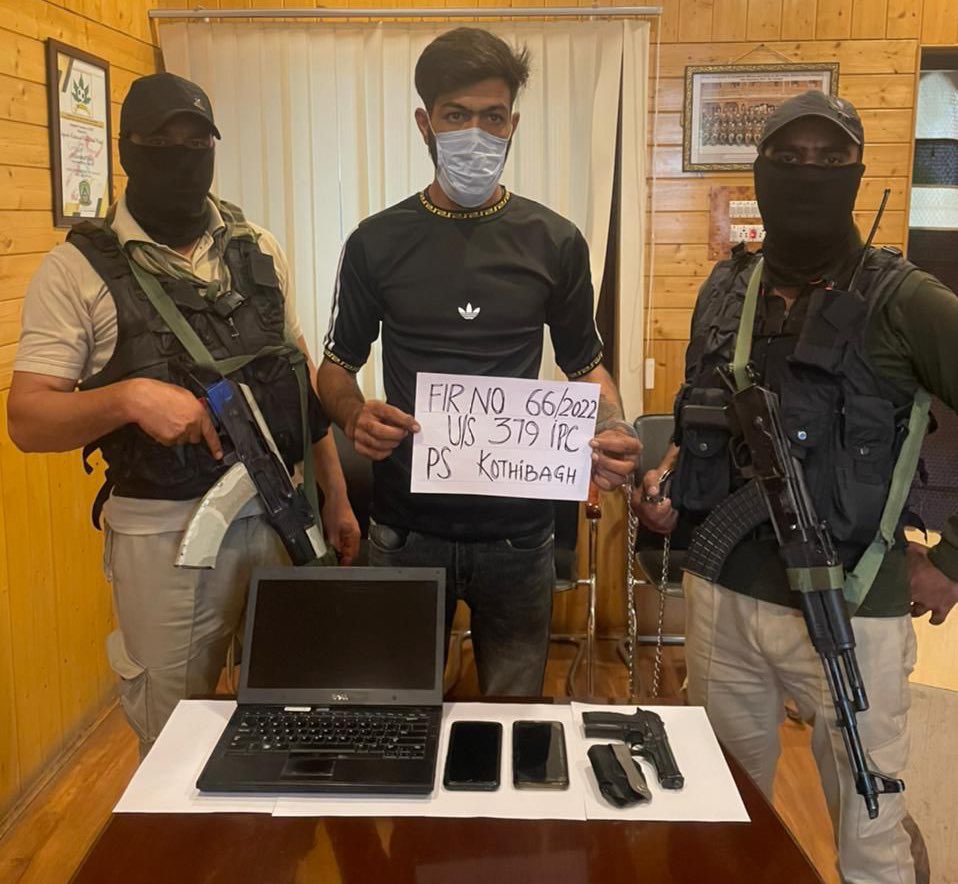 “Extortionist namely Umer Qadir Dar S/o late Gh Qadir Dar R/o Harnambal Zaffar colony Natipora, he was using fake pistol for intimidation. 02 mobile phones,01 laptop also recovered from his possession. On this, case under FIR No. 66/2022 registered at kothibagh Police station,” a police spokesman said.