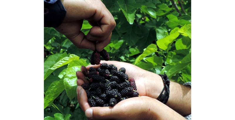 Farmers plucking Mulberry at a farm on the outskirts of Srinagar on Monday.(UNI)