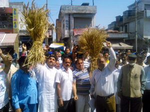 Kathua, Mar 25: Farmers under the banner of Kissan Movement marched to DC office and held a massive protest demonstration by blocking college road for half an hour in front of DC office here and submitted memorandum declaring their opposition to the Modi Government’s proposed Land Acquisition Bill.