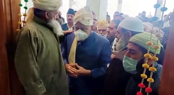 Before paying obeisance, the imam and khateeb of the shrine performed ‘dastar bandi’ of the National Conference chief.