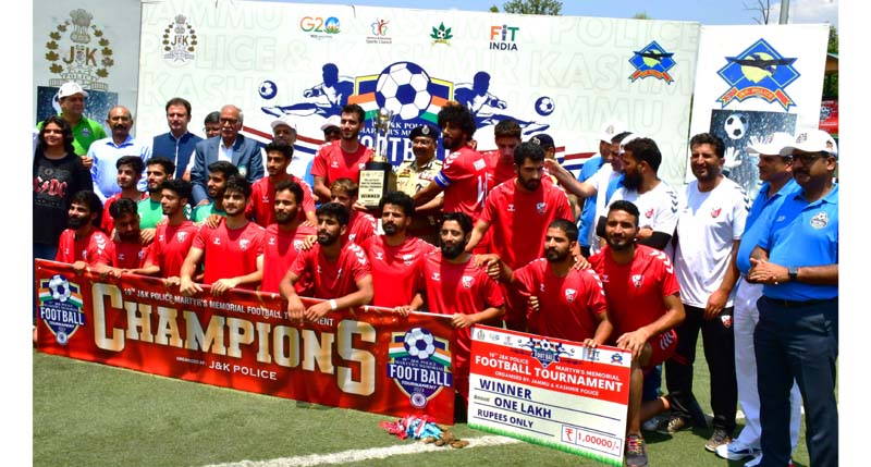 SRINAGAR, Aug 1: The 19th J&K Police Martyrs Memorial Football Tournament-2023 organized by Jammu and Kashmir Police under Civic Action Programme and in collaboration with J&K Football Association, J&K Sports Council concluded at Synthetic Turf Ground TRC Srinagar today with FC-1 among Men teams and Kashmir Arrows among Women teams emerging as tournament champions.