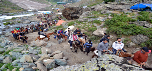 Fifth batch of yatris on way to holy cave via Nunwan track on Wednesday.  —Excelsior/Sajad Dar
