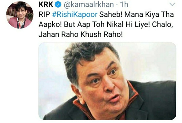 On April 30, Khan had allegedly taken to Twitter to announce Rishi Kapoor’s hospitalisation and tweeted saying that the actor must not die as wine shops were set to open soon, he said.
