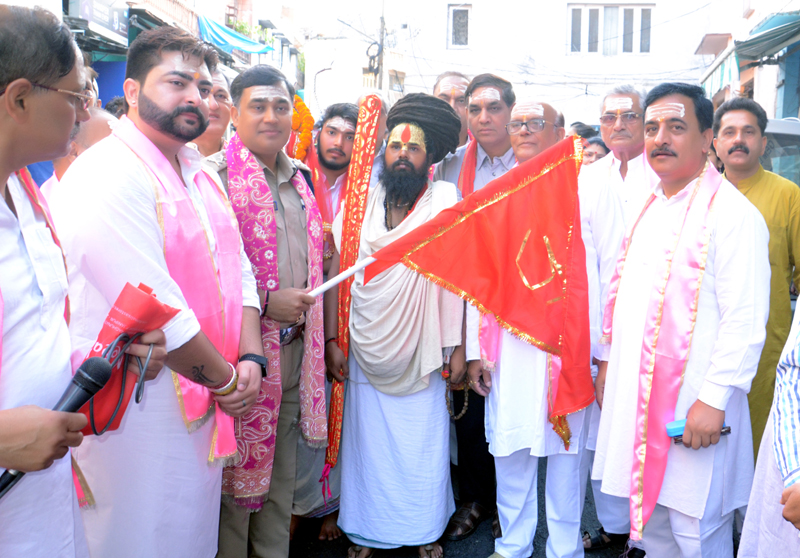 JAMMU, June 18: Sudhmahadev Chhari Yatra Aayojan Samiti and Vishav Jan Kalyan Sangh organized first ever Chhari Yatra for the ancient temple of Sudhmahadev, which was flagged off early morning from Panjbaktar temple (Rupayee Wala Mandir) Jammu.