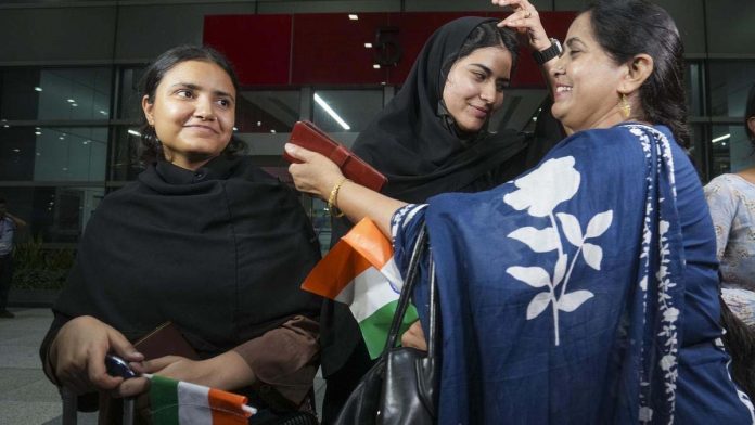 Indian students returning from Iran via Armenia, under an evacuation operation facilitated by the Government of India, react as they meet their relatives while exiting from the Indira Gandhi International Airport, in New Delhi