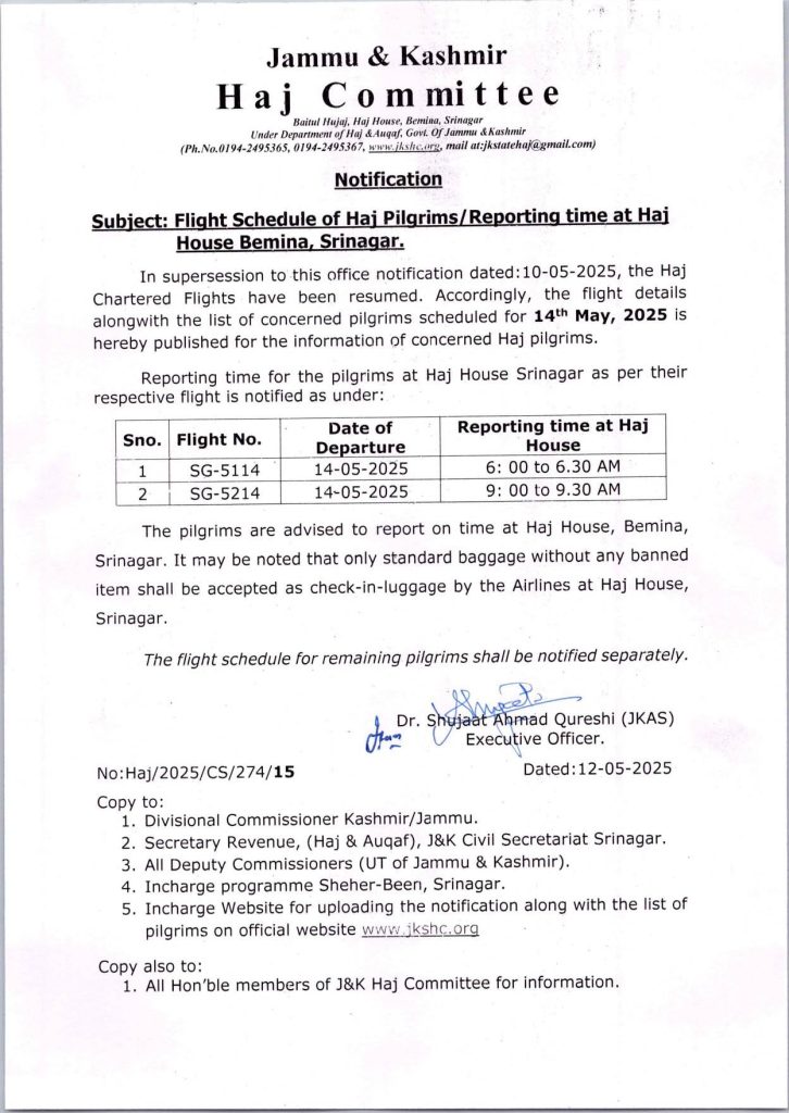 JAMMU, May 11: The Jammu and Kashmir Haj Committee has issued a fresh notification, releasing the flight schedule of Haj pilgrims departing on May 14, 2025.