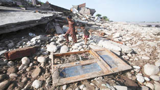 Flood affected children walk amidst the debris of a residential house which was damaged by floods on the banks of the river Tawi in Jammu. -Excelsior/Rakesh