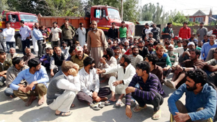 Flood affected people protesting in front of DC Pulwama office demanding restoration of Samboora-Bahebagh road on Monday. —Excelsior/Younis Khaliq