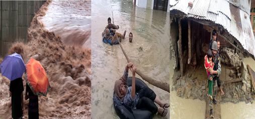 Flood Fury: Boys watching flooded river Tawi in Jammu, jawans of 9 IRP rescue people at Pantha Chowk in Srinagar and an Army jawan of 2 RR helps children to safety at Kangamdara in Magam area of Baramulla on Thursday.     — Excelsior pics by Rakesh, Amin War and Aabid Nabi