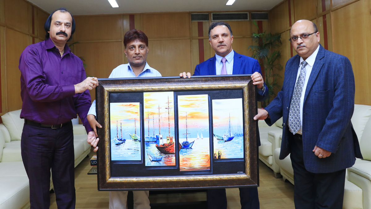 Foot artist, Uttam Kumar Bharadwaj presenting a painting to J&K Bank Chairman, Parvez Ahmed.