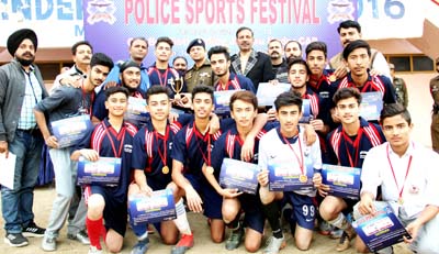 Winners posing along with dignitaries and officials during Police Sports Festival at MA Stadium in Jammu.