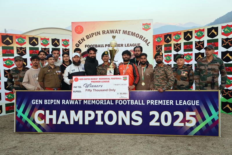 BANDIPORA, Nov 7: The inaugural General Bipin Rawat Memorial Football Premier League, organised by Chinar Corps’s Counter Insurgency Force (Kilo), concluded at Sher-e-Kashmir Stadium, here today. The tournament, held in honour of India’s first Chief of Defence Staff, aimed to promote sportsmanship, discipline and youth engagement in Kashmir.