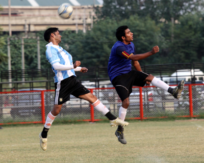 Footballars taking long hops to get hold of the ball during a match of Senior Division Football League Tournament in Jammu on Saturday. -Excelsior/Rakesh