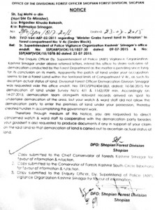 The notice to Taj Mohi-ud-din has been served by name by the Divisional Forest Officer (DFO), Shopian vide order No. DFO/SPR/817-20/L dated 23/7/2015.