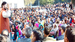 Forest Minister, Ch Lal Singh speaking during public grievances redressal camp at Kathua on Sunday.