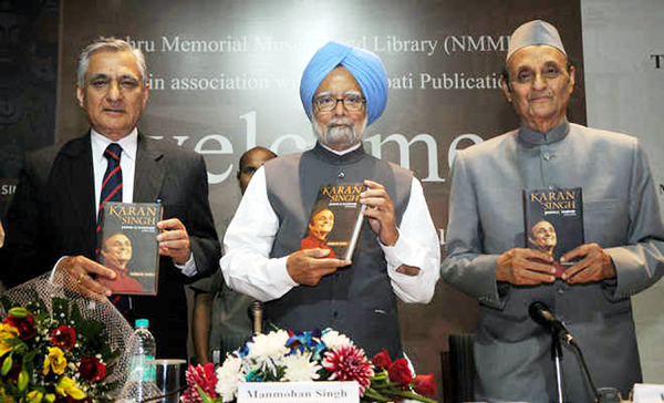 Former Chief Justice of India T S Thakur, former PM Dr Manmohan Singh and Dr Karan Singh releasing the book in New Delhi on Friday.