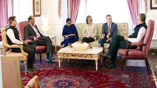 Former Chief Minister Omar Abdullah interacting with a delegation from Canadian High Commission at Srinagar on Wednesday.