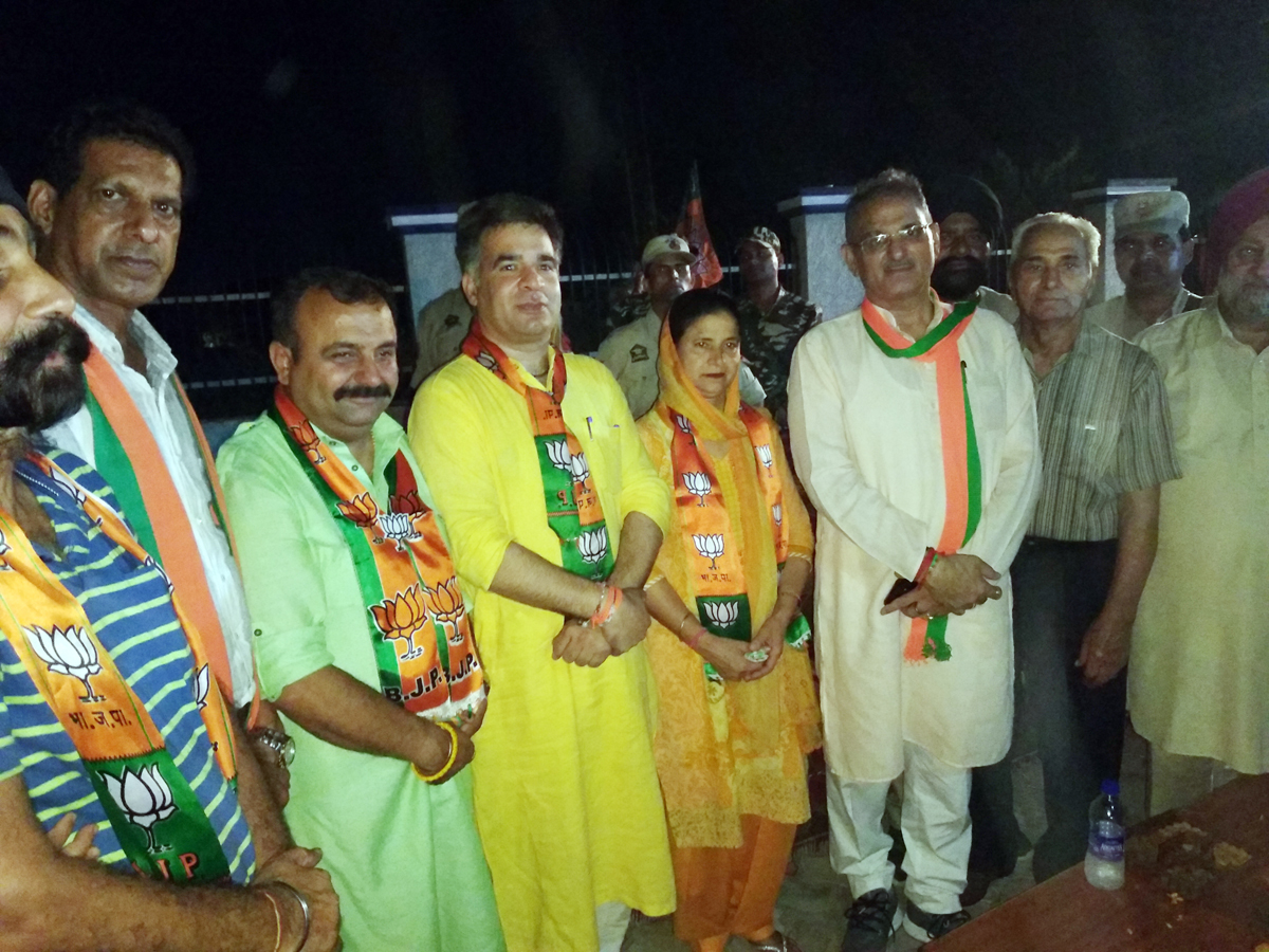 Former Deputy CM, Kavinder Gupta, BJP State president, Ravinder Raina & MLC Vikram Randhawa at an election meeting in Gandhi Nagar on Thursday.