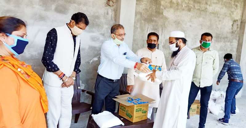 Former Dy CM Kavinder Gupta distributing ration in Masjid Mohalla Bahu on Thursday.