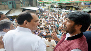 Former Indian cricket team captain and AICC leader Azharuddin and PCC chief, GA Mir addressing a public meeting at Anantnag on Monday.