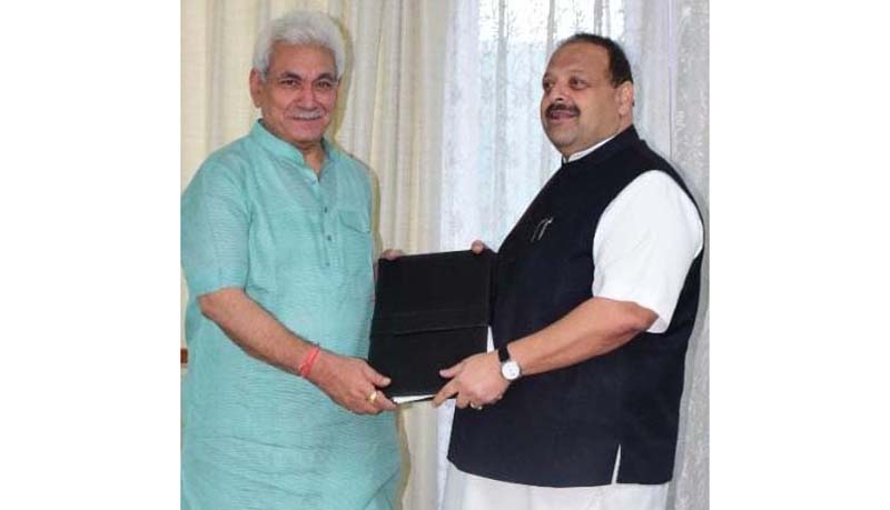 Sham Lal Sharma, former minister also called on the Lt Governor and apprised him about channelization of River Chenab on the pattern of River Jhelum, early completion of bridge over Indri Patan, Degree College in Sub-Division Chowki Choura, speedy construction of Mini Secretariat at Akhnoor.