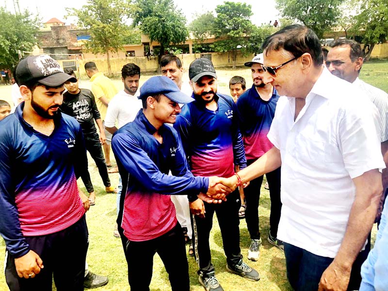 Former Minister and BJP leader Sham Lal Sharma interacting with players during inaugural ceremony of the final match at Jourian on Friday.
