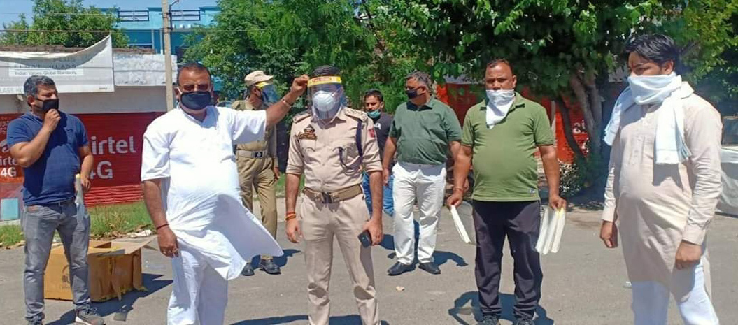 Former Minister C P Ganga distributing face masks among police personnel on Tuesday. —Excelsior/Badyal