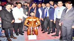 Former Minister, Raman Bhalla and other dignitaries posing along with winner of Mr Jammu Body Building and Fitness Championship.