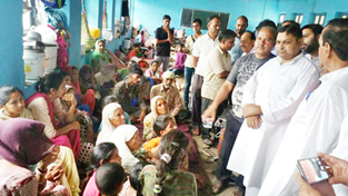 Former MP and senior Congress leader Madan Lal Sharma, interacting with shelling victims in a migrant camp at Nowshera in Rajouri district.