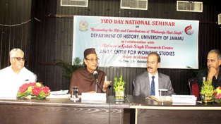 Former Sadr-e-Riasat Dr Karan Singh speaking at a seminar in Jammu University on Monday. -Excelsior/ Rakesh