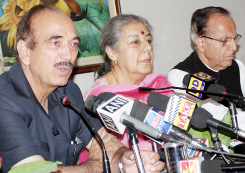 Former Union Health Minister Ghulam  Nabi Azad, flanked by AICC general secretary Ambika Soni & PCC chief Prof Saif-ud-Din Soz addressing press conference in Jammu on Sunday.     -Excelsior/Rakesh