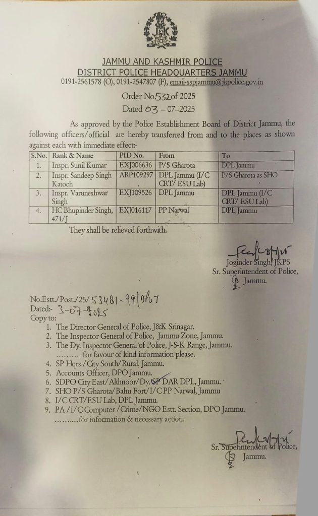 Four Police Officers Transferred By Daily Excelsior - July 3, 2025 Share FacebookTwitterWhatsAppPinterestLinkedinCopy URLTelegramEmailTumblrReddItPrintKoo JAMMU, Jul 3: The Senior Superintendent of Police (SSP) Jammu, Joginder Singh, has ordered the transfers and postings of four police officers and officials. Follow our WhatsApp channel