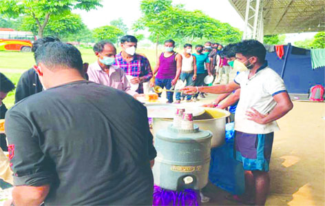 As I entered the facility and started talking to the inmates already present there, I was informed that there was a family of four people that was tested COVID positive on the same morning. Although they were shifted to Government Medical College Jammu, the quarantine facility was not sanitized post that. Nobody knew which beds they used or where they sat. I had no other option but to look for a bed and hope it wasn’t used by anyone from the family that tested positive. I chose a bed and pulled it as far as I could towards the edge of the shed and attempted to disinfect the bed with my hand sanitizer. I did not take a mattress or a pillow because all of them were used and none of them even looked clean. Soon I saw people gather in a line near one end of the shed as two people served rice and lentil soup (Daal-Chawal) for dinner. Somehow, most people already had a melamine plate and almost all plates were the same.