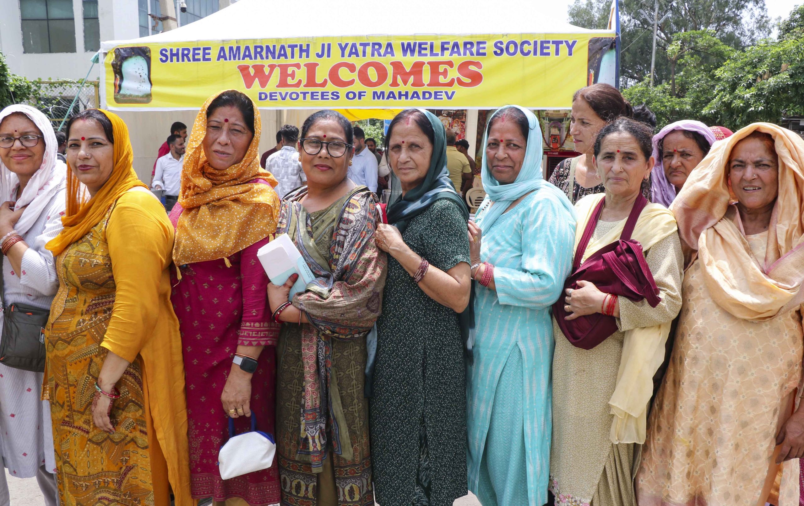 Pilgrims wait in a queue to collect food during the annual Amarnath Yatra, in Jammu.