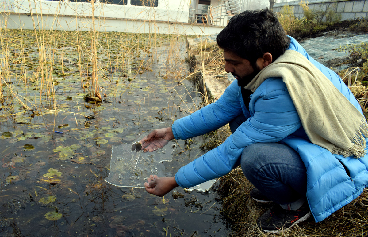 A man shows a piece of frozen ice at Dal lake in Srinagar on Tuesday. -Excelsior/Shakeel