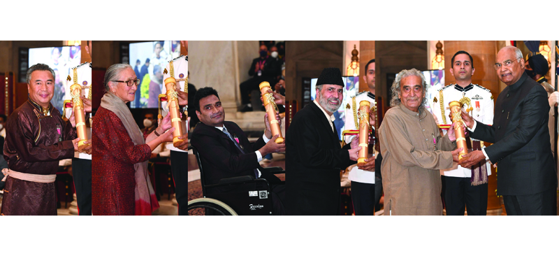 (From left) Chewang Motup Goba, Dr Tsering Landol, Javed Ahmed Tak,Muzaffar Hussain Baig and Prof Shiv Datt Nirmohi receiving Padma awards from President Ram Nath Kovind in New Delhi on Monday.